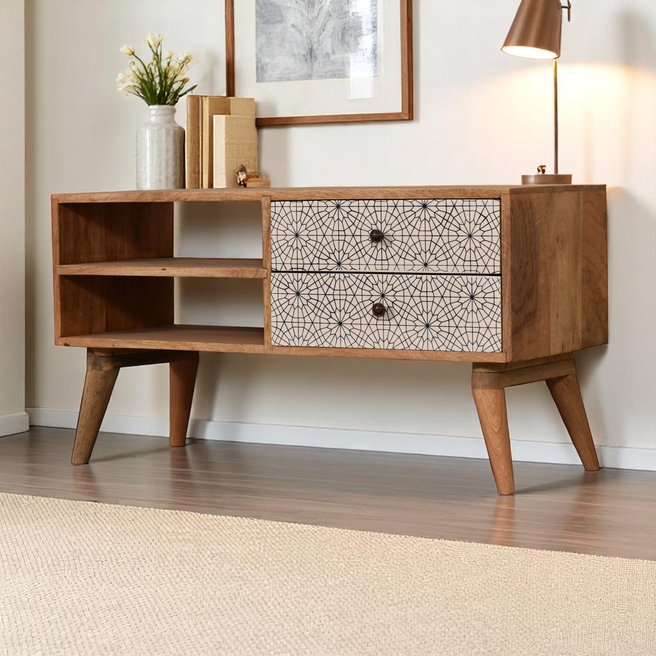 This 2 drawer media unit has been constructed from 100% solid mango wood and finished in a fine oak-ish finish body. The main feature of this piece are the screen printed drawer fronts and which each have a beautiful black and white geometric design giving the piece extra dimension and character. Useful storage is provided with the open slots and drawers that can be used to store any CD’s, films or books.