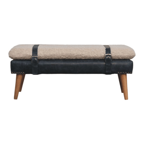 The Boucle x Olive Green Leather Bench showcases a harmonious blend of texture and elegance. Upholstered in 100% cotton boucle fabric and accented with genuine Buffalo hide leather, this piece exudes sophistication and warmth. The belted strap design adds a touch of character, while the nordic solid wood legs, finished in a classic oak-ish tone, provide durability and support. Perfect for entryways, bedrooms, or living spaces, it combines timeless craftsmanship with modern aesthetics to elevate your home décor.