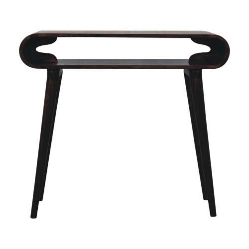Explore our Amaya range featuring this simple open console table which is constructed from 100% solid mango wood in a california walnut finish and features nordic style legs and smooth round edges, which will give a modern feel to the home as well as be safe around small children and animals. Display this piece beautifully in your home and allow the natural grain pattern to really shine.