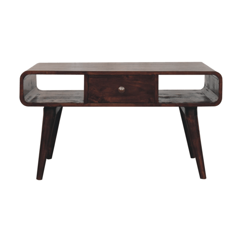 This Coffee Table offers clean, curved edges and has been constructed from 100% Solid Mango Wood in a rich,california walnut finish. Some features include 2 drawers that have a shiny knob, 2 open slots to place any books, photo frames or ornaments and stands on 4 Nordic style legs.