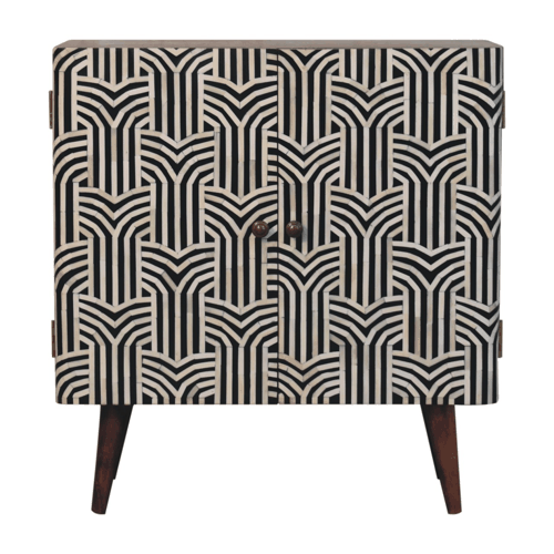 This beautiful boho inspired cabinet has been constructed from 100% solid mango wood and has a honey caramel finish. Other features include bone inlay front doors, and Nordic style legs. The bone inlay is sourced responsibly from deceased animals such as camels, goats, and buffaloes.
