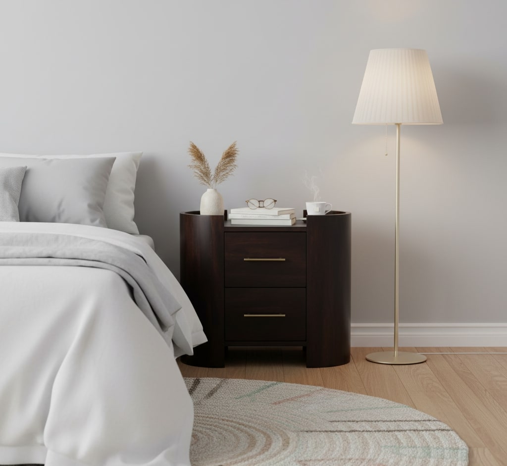 The Velvet Mocha Curve Bedside is a statement of modern sophistication, crafted from solid mango wood in a rich velvet mocha finish. Its smooth curved sides, paired with sleek brass handles, create a bold yet refined look. With two generous drawers, it offers both style and function, making it a perfect addition to any contemporary bedroom.